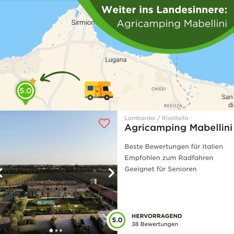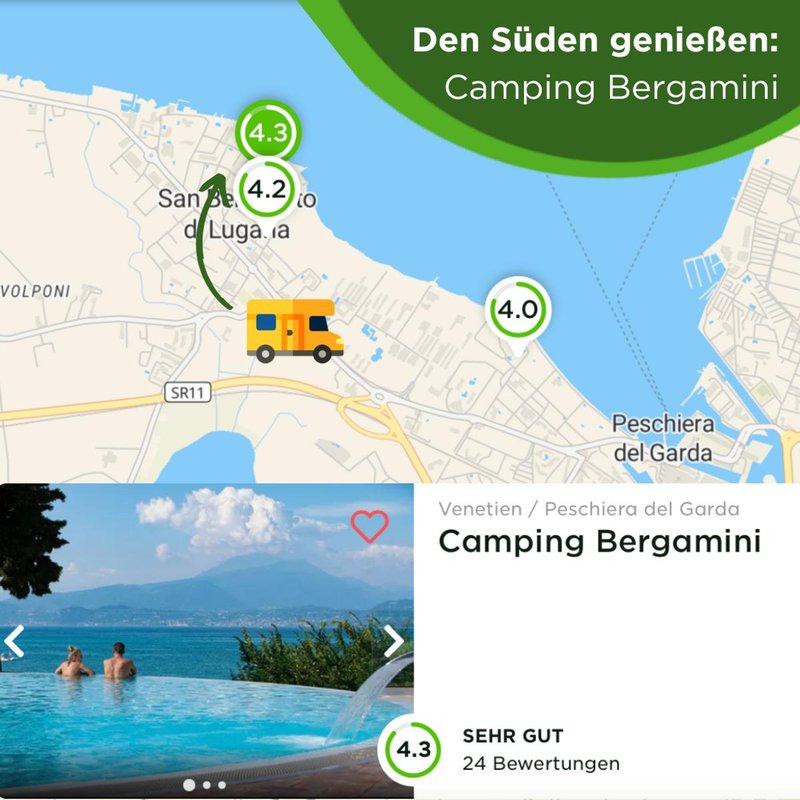 Der nächste Campingplatz liegt nicht weit und so erreichst du in nur 15 Minuten Camping Bergamini im schönen San Benedetto di Lugana. Nur einen Kilometer von Peschiera del Garda entfernt, kommen Weinliebhaber hier ganz auf ihren Geschmack, denn San Benedetto di Lugana gilt als eines der ursprünglichsten Weinanbaugebiete in ganz Europa. Die Trauben des Trebbiano di Lugano werden zu köstlichem Weißwein gekeltert, den du unbedingt probieren solltest!