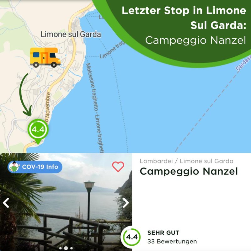 Auf unserer letzten Etappe legen wir noch einmal 45 Kilometer Richtung Norden zurück und erreichen nach gut einer Stunde Campeggio Nanzel vor den Toren der bezaubernden Zitronenstadt Limone sul Garda. Der beliebte Urlaubsort liegt am Fuß eines steilen Berghanges, terrassenförmig zum Gardasee gebaut. In den Gassen unterhalb der Olivenhaine und zahllosen Zitronengärten schlingen sich verwinkelte Gässchen vorbei an den bunten, in den Fels gebauten Häusern. Wo sich einst Österreich und Italien trafen, liegt heute das romantische Örtchen Limone sul Garda.