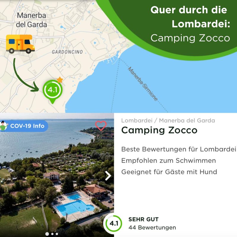 Direkt am Ufer des Gardasees findest du Camping Zocco mit über 240 Standplätzen. Durch seine Nähe zu den schönen Stränden schätzen ihn Camper besonders zum Baden und Motorbooten. Für Familien mit Kindern gibt es neben einem Kinderspielplatz auch einen großen Pool, sowie die Möglichkeit Tischtennis oder Volleyball zu spielen. Auch Camper mit Hund empfehlen diesen Platz besonders. Prüfe jetzt auf camping.info die Verfügbarkeit für einen Standplatz beim Camping Zocco