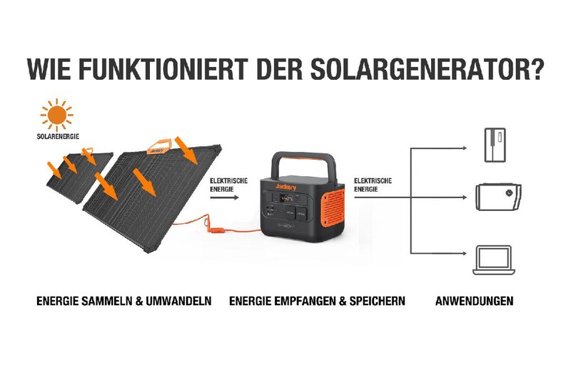 Und so geht's: Der Jackery Solargenerator kombiniert eine tragbare Powerstation mit einem faltbaren Solarpanel. Das System wandelt die vom Solarpanel eingefangene Sonnenenergie in elektrische Energie um und speichert sie anschließend in einer tragbaren Powerstation zur späteren Nutzung.