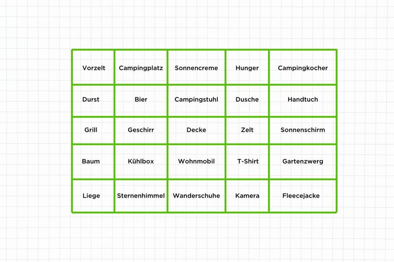 Du kennst bestimmt das klassische Bingo mit Zahlenreihen. Man zeichnet ein Quadrat mit 4x4 oder 5x5 Kästchen auf ein Blatt und trägt die Zahlen von 1-16 oder 1-25 ein. Anschließend werden Zahlen gezogen. Das geht so lange, bis ein Spieler eine Zahlenreihe voll hat. Dabei ist wichtig, dass die Zahlenreihe in der Richtung diagonal, senkrecht oder waagerecht liegt. Wie wärs mit Bingo mal anders? Camping-Buzzword Bingo zum Beispiel. Anstelle der Zahlen schreibst du typische Camping Begriffe (Campingstuhl, Natur, Campingplatz) oder kurze Sätze, die beim Campen häufig fallen (“Was kochen wir heute?”, “Ich habe hunger”, “hast du alle Fenster zugemacht?”)