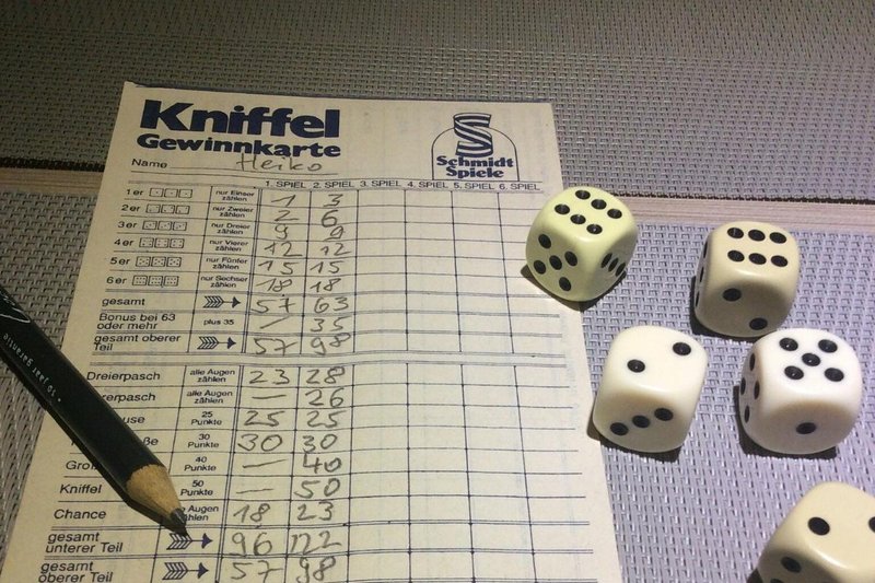 Kniffel gilt als Klassiker unter den Würfelspielen und darf in keinem Campingurlaub fehlen. Ziel des Spiels ist, clever zu würfeln und am Ende die meisten Punkte auf dem Kniffel-Block zu erreichen. Die Spieler sind reihum einmal pro Runde mit dem Würfeln an der Reihe. Dabei können sie bis zu dreimal würfeln. Der erste Wurf erfolgt mit allen fünf Würfeln. Danach kann der Spieler sich entscheiden, mit wie vielen Würfeln er beim 2. und 3. Versuch würfeln möchte. Dabei lässt er die Würfel, die er behalten möchte, vor sich liegen, und würfelt nur mit denen, die ihm „nicht gefallen“. So kann er versuchen, sein Ergebnis mit dem 2. und 3. Versuch zu verbessern. Er kann aber auch auf einen oder beide Zusatzwürfe verzichten. Spätestens nach dem dritten Wurf muss der Spieler sein Wurfergebnis in den Kniffel-Block eintragen lassen. Erfüllt der Wurf keine der Bedingungen für die Kästchen, wird ein beliebiges Kästchen „gestrichen“ und eine Null eingetragen. Da das Spiel nicht besonders knifflig ist, kannst du es mit der ganzen Familie spielen.