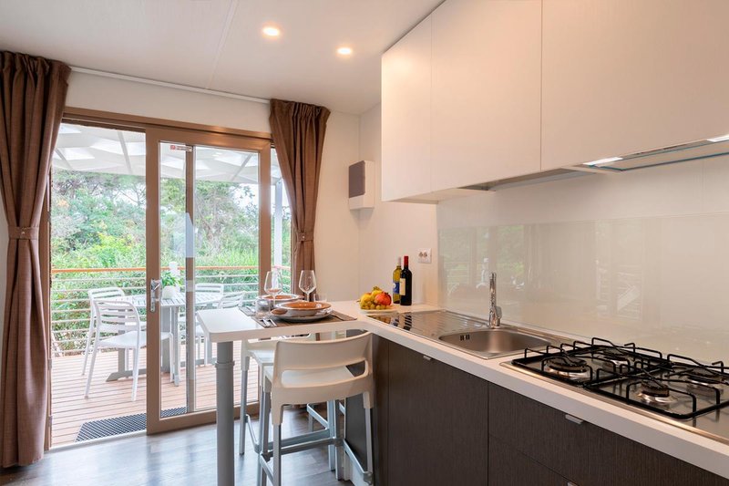 Camper ohne eigenes Fahrzeug werden im zugehörigen Feriendorf glücklich. Das kleine “Village” ist umgeben von idyllischen Pinientannen und liegt eingebettet in herrlich mediterraner Macchia. In drei verschiedenen Bereichen sind die voll ausgestatteten und modernen Mobilheime verschiedener Kategorien die perfekte und besonders komfortable Unterkunftsmöglichkeit für Camper ohne eigenen Wohnwagen, Wohnwagen oder Zelt.