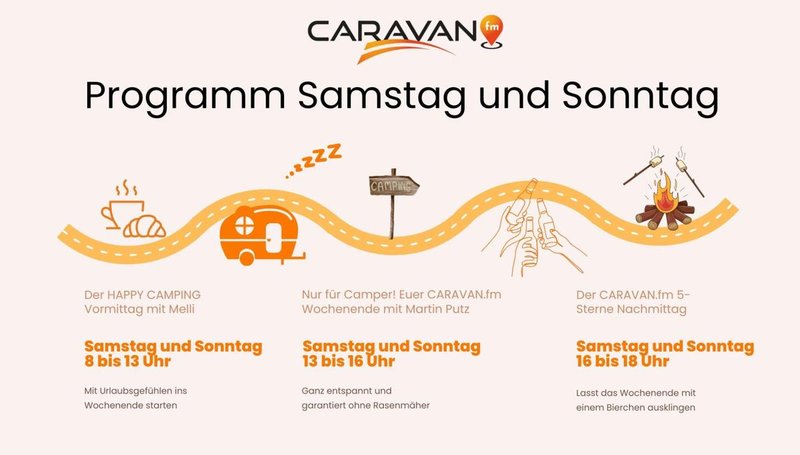 Doch CARAVAN.fm ist mehr als nur gute Musik! Von der beliebten CARAVAN.fm Brötchenshow bis zum 5-Sterne-Nachmittag fürs Bierchen am Wochenende: Das, was CARAVAN.fm ausmacht, ist das viele Camping "drumherum": Ob geprüfte Platz-Tipps, lustige Camper-Geschichten oder praktische Gadgets – inspiriert von Campern für Camper bringt das Team hinter den Mikrofonen die besten Tipps, Trends und aktuelle Events rund ums Thema Camping in dein Radio.