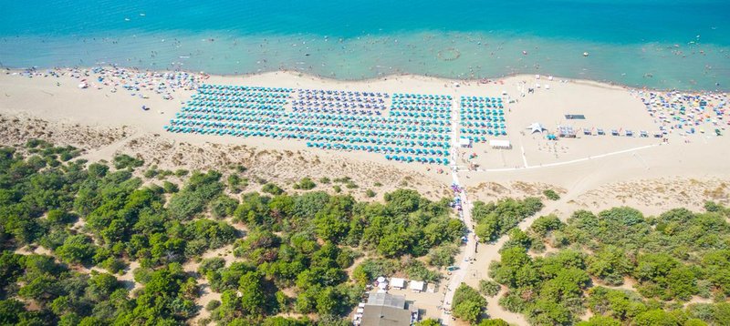 Der Strand ist nur etwa 800 Meter vom Herzen der Campinganlage Cieloverde entfernt und mit einem Shuttle-Zug, per Rad oder zu Fuß erreichbar. Der kurze Radweg durchquert dabei den wunderbaren, maritimen Pinienwald und du kommst während der Fahrt in den vollen Genuss der tyrrhenischen Küste. Gleich hinter den Dünen liegt auf der linken Seite der knapp 200 Meter lange Privatstrand vom Cieloverde Camping Village, während sich auf der rechten Seite ein endloser Strand erstreckt. Für Snacks, Speisen und kalte Getränke ist an der Delfinus Beach Bar gesorgt.