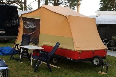 Abbildung 1 – Enge Stellplätze sind nervig. Hier zu sehen ein aufgebauter Faltcaravan auf einem vollen Campingplatz in Schweden