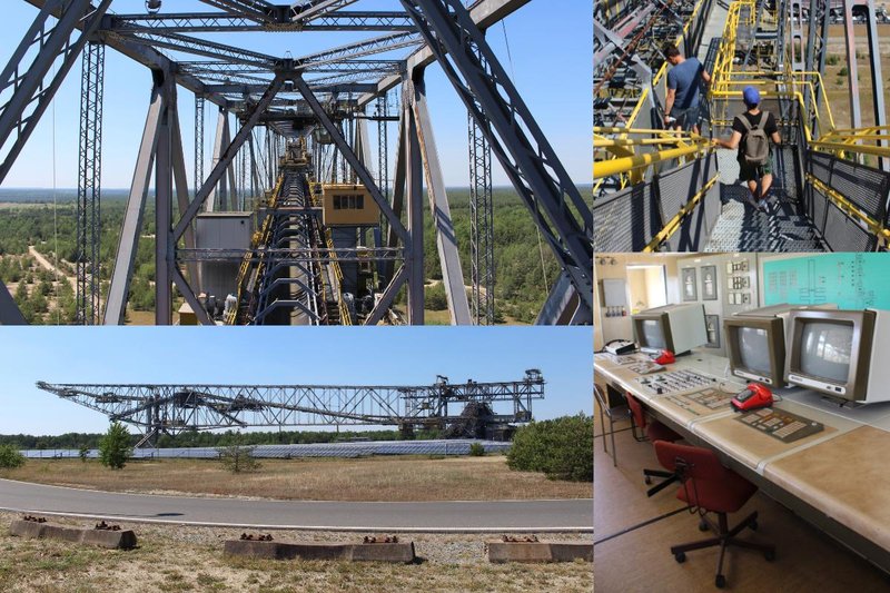 Schon bei der Ankunft in Lichterfeld begeisterte uns der Stahl-Gigant und wir konnten es gar nicht abwarten den Aufstieg zu beginnen. Mit dem erfahrenen Besucherführer Konrad ging es dann auch schon hoch hinaus. Die ehemalige Abraumbrücke ist eine der größten beweglichen technischen Arbeitsmaschinen der Welt. Obwohl sie von Februar 1991 bis Juni 1992 nur etwa eineinhalb Jahre in Betrieb war, bewegte sie in der Zeit rund 27 Millionen m³ Abraum. Das entstandene Tagebaurestloch wurde 2001 geflutet. Von der 74 Meter hohen Spitze aus erwartete uns eine spektakuläre Aussicht auf den entstandenen Bergheider See und das umliegenden Lausitzer Seenland. Auf dem Weg nach unten durften wir sogar einen Blick in den originalgetreuen Leitstand werfen, von dort aus wurde der stählerne Riese gesteuert. Auf der 90-minütigen Tour haben wir jede Menge Wissenswertes erfahren. Wir wollen euch hier zu viel vorwegnehmen, überzeugt euch selbst!