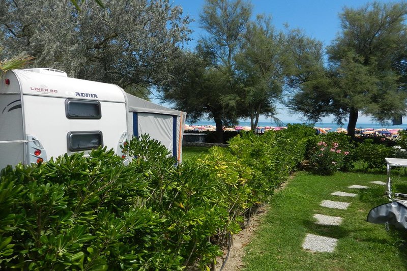 Auf dem naturbelassenen, circa 16 Hektar großen Areal fühlst du dich auf den großzügigen Standplätzen unter hohen Bäumen rundum wohl. Insgesamt bietet der Platz und 350 grüne Parzellen. Die beliebtesten Stellplätze unter Campern sind die der Kategorie “Premium Mare” – auf den circa 200 m² großen Parzellen inkl. Strom bis zu 10 Ampere, Wasser- und TV-Anschluss sowie freiem WLAN genießt du den wunderbaren Blick auf die Wellen der azurblauen Adria direkt vom Campingstuhl aus.