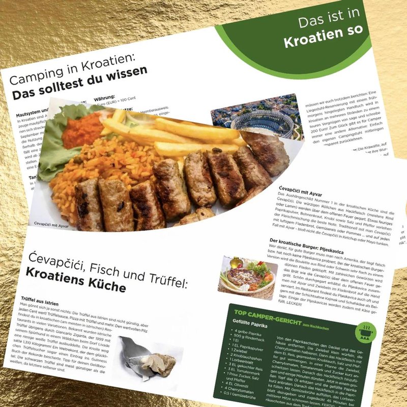 - Länderspezifische Highlights: Witzige Fakten, kulinarische Empfehlungen und Campingrezepte zum Nachkochen.