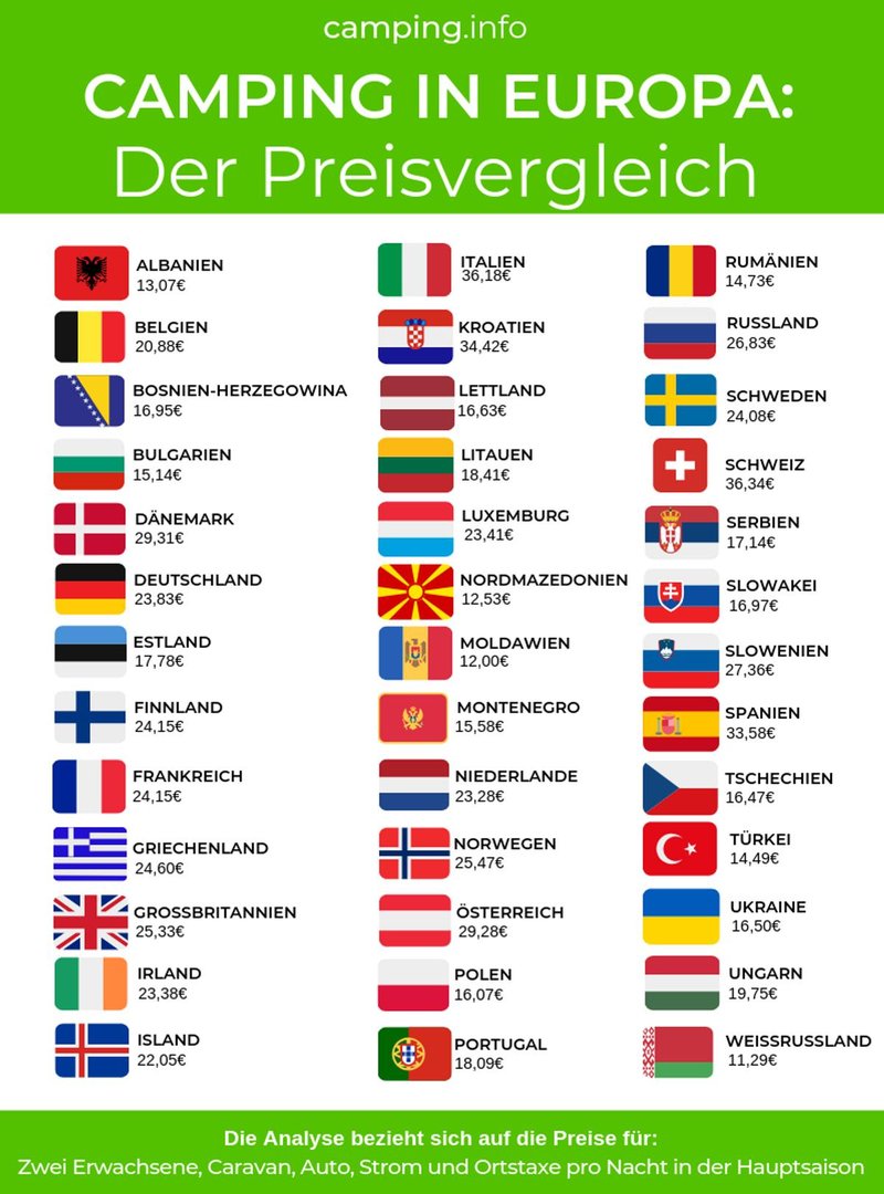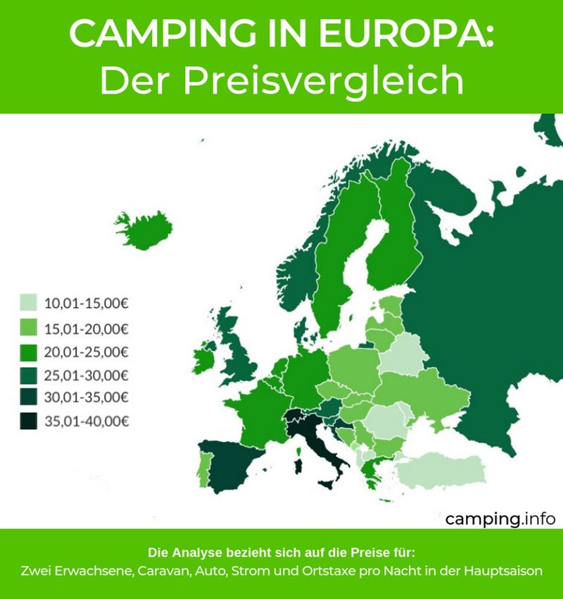 In Deutschland kostet eine Campingnacht 23,83 Euro. „Damit zählen die Campingplatzbetreiber in Deutschland zu den preiswerteren Anbietern von Campingurlauben", erklärt Maximilian Möhrle, Geschäftsführer von camping.info. „Im Preis-Leistungs-Vergleich liegen Deutschlands Campingplätze ganz vorne. Vor allem unter Einberechnung des Komforts und dem umfangreichen Freizeitprogramm, das geboten wird."