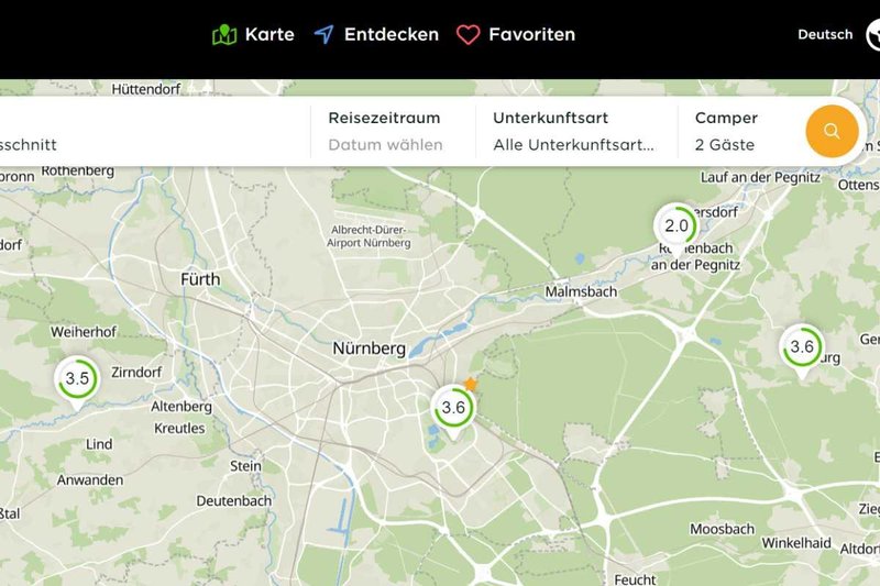 Eine weitere Möglichkeit, wie du Campingplätze in deiner Nähe finden kannst, ist die Kartensuche auf camping.info. Hier werden dir alle Campingplätze angezeigt und du kannst die Karte mit Zoomen und Scrollen genau so verschieben, dass du in deiner Wunschregion landest. Ein Klick bringt dich dann direkt auf die Seite des Campingplatzes.