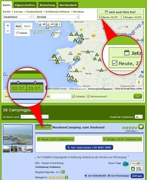 Bei den Campingplätzen die noch Stellplätze frei haben, kann man auf das Kalendersymbol (siehe Screenshot) klicken und erfährt dann näheres dazu. Auch die Telefonnummer wird dort angezeigt, denn bei kurzfristiger Anreise ist ein kurzer Anruf vorher meist empfehlenswert.