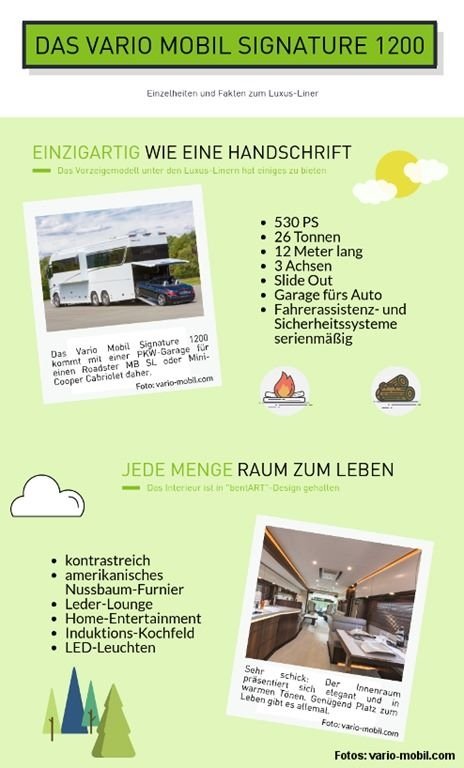 Wer das nötige Kleingeld hat, wird sich mit dem Vario Mobil Signature 1200 anfreunden können. Dieser Liner kostet die Kleinigkeit von 786.990 Euro. Dafür bekommt der Urlauber ein Reisemobil, dem es an Luxus kaum mangelt. Aufgebaut auf einem Mercedes Actros 2553 LLL ist das Fahrzeug komplett frei konfigurierbar. Vier Personen können dank der zweiten Sitzreihe hinter Fahrer und Beifahrer mitfahren. Dabei glänzt das Mobil nicht nur wegen seiner ausfahrbaren Seitenwände, sondern auch durch raffinierte Kleinigkeiten. So fahren die Schubladen zum Beispiel automatisch zu, sobald das Fahrzeug sich bewegt. Und natürlich findet auch der Roadster in der Heckgarage Platz.