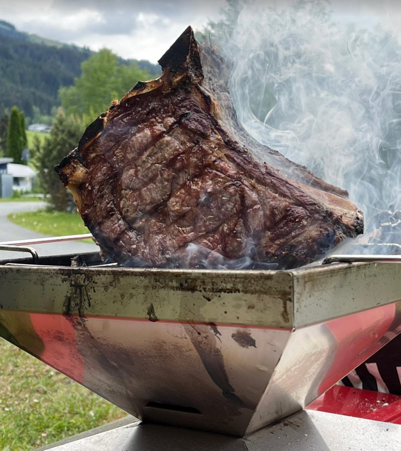 Der Edelstahl-Standfuß mit Kratzschutz eignet sich universell für flachen Untergrund ebenso wie für den Campingtisch oder Garten. Mein erster Test: Ein 3,5 kg Florentiner Steak mit Holzkohle. Was sofort auffällt, ist die wirklich hochwertige Verarbeitung des T1. Kein Wunder, dass Thüros 25 Jahre Garantie gibt. Wenn man auf Wertigkeit und Qualität Wert legt, ist man schon vor dem Grillen glücklich.
