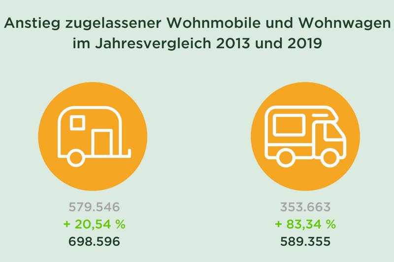 Die Beliebtheit von Campingurlauben zeigt sich auch in den Zulassungsstatistiken von Freizeitfahrzeugen. Insgesamt sind in Deutschland 1.287.951 Freizeitfahrzeuge zugelassen. Ein Plus von knapp 7 Prozent. Im letzten Jahr wurden 53.920 Reisemobile und 26.496 Wohnwagen neu zugelassen. Maximilian Möhrle, der Geschäftsführer von camping.info dazu: "Die neu zugelassen Fahrzeuge drängen zusätzlich zum Bestand auf Europas Camping- und Reisemobilplätze und werden so für ein weiteres Wachstum sorgen." Die Grafik zeigt den Anstieg der zugelassenen Wohnmobile und Wohnwagen im Jahresvergleich 2013 und 2019.