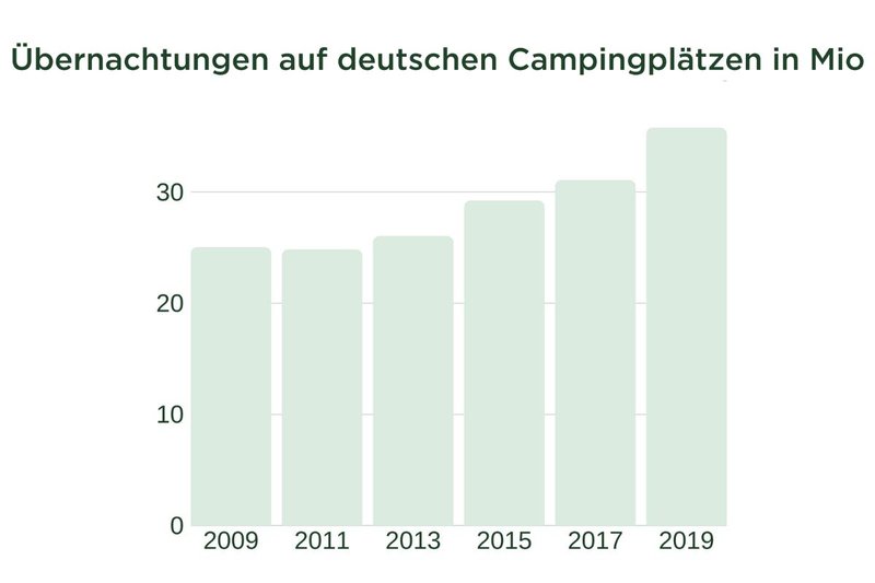 Der Campingboom in Deutschland ist seit sechs Jahren ungebrochen. Im Jahr 2019 freuten sich Deutschlands Campingplatzbetreiber über 35.756.382 Nächtigungen. Das entspricht einem Zuwachs von 3,5 Prozent gegenüber dem Jahr 2018. Nach den Auswertungen von camping.info beträgt die Steigerung seit dem Jahr 2010 über 46 Prozent. In der Grafik werden die Übernachtungen auf deutschen Campingplätzen in Mio. von 2009 bis 2019 dargestellt.