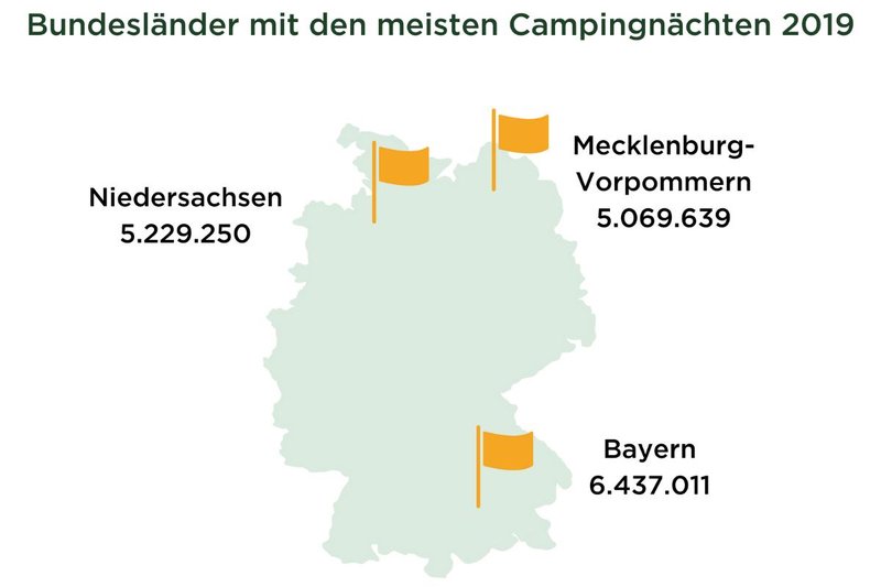 Auf der Grafik sind die Bundesländer mit den meisten Campingnächten 2019 dargestellt. Die gefragtesten Bundesländer zum Campen sind: Bayern, Niedersachsen und Mecklenburg-Vorpommern. Mit 6,4 Millionen Nächtigungen und einem Zuwachs von 4,26 Prozent ist Bayern das beliebteste Camping-Bundesland in Deutschland. Dahinter folgen Niedersachsen, Mecklenburg-Vorpommern und Baden-Württemberg. Mit Ausnahme von Hamburg, wo ein Rückgang von 1,27 Prozent verzeichnet wurde, konnten im letzten Jahr alle Bundesländer dazugewinnen. Die größten Zuwächse verzeichneten das Saarland mit 17,6 Prozent, Berlin mit 12 Prozent und Sachsen-Anhalt mit 11,6 Prozent mehr Camping-Nächtigungen.